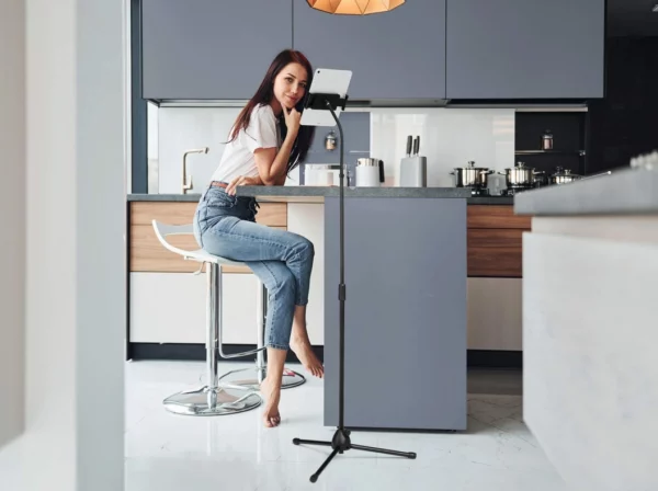 Hållare för surfplatta eller mobil 4,7″-13″. Golvstativ med teleskopstång och böjbar svanhals för enkel justering av höjd och vinkel. Golvstativet passa lika bra på mässan som i hemmet!